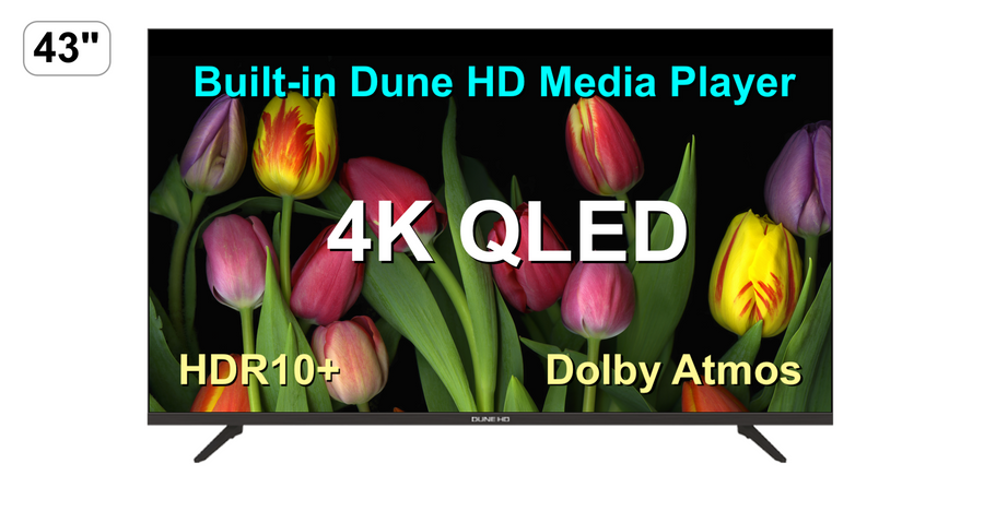 Legendary Dune HD media player capabilities are now built directly into the TV — no external devices required. All Dune HD media player features are accessible through the built-in Dune HD media center app, conveniently available on the home screen and via dedicated buttons on the remote (DUNE, Files, Apps, Recent, TV).