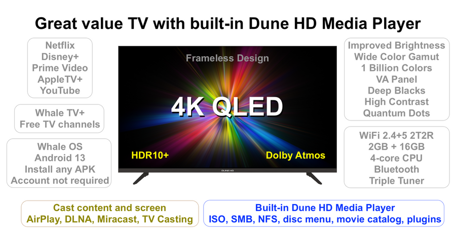 Android + Dune HD + Whale OS. Everything you need right out of the box. Lightweight and fast system with no account required. Certified streaming services, free installation of Android apps from app stores and APK files, plus AirPlay, DLNA, Miracast, and Whale TV Casting for easy media and screen sharing from a smartphone. Control the TV directly from your phone.