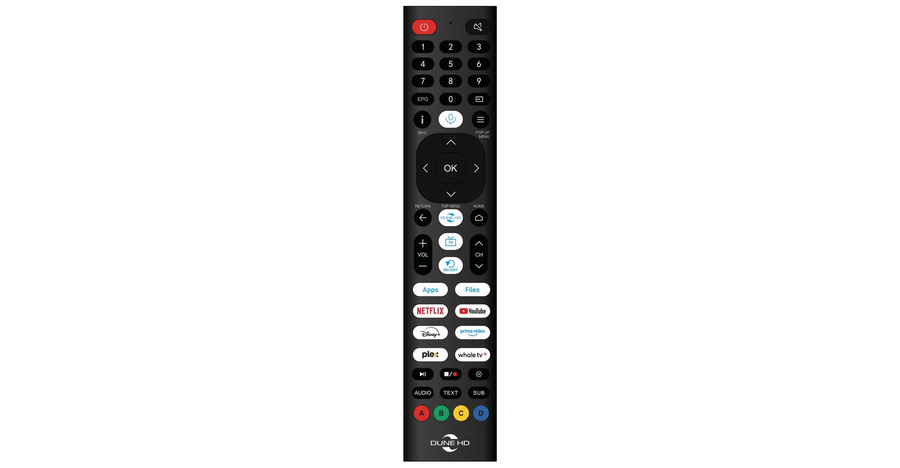 A full-featured remote with 49 buttons includes voice search, numeric keys, and dedicated controls for Dune HD media center functions. Six separate buttons launch popular video services instantly. A customizable button allows one-touch access to TV viewing, configurable for terrestrial or IPTV channels.