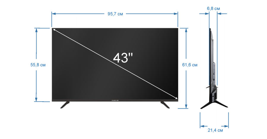 A QLED panel with rich color reproduction, a high-contrast VA matrix with deep blacks, Dolby Atmos support, AV1 decoding, a fast quad-core processor, 2 GB RAM + 16 GB storage, powerful dual-band Wi-Fi (2.4/5 GHz, 2×2), and a Bluetooth voice remote. Triple tuner DVB-T2/S2/C with recording and time-shift support.